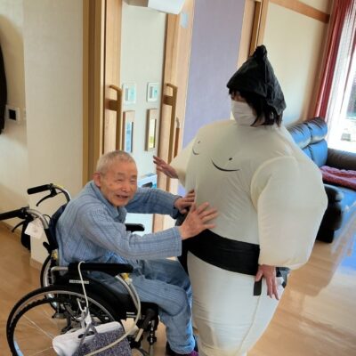 入所者の皆さんは仮装に戸惑いながらも、お菓子を手に一緒に記念撮影をして楽しみました。