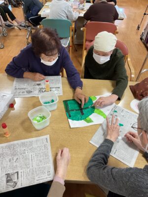 全体作品作りは、全員で鶴や亀のイラストに折り紙を貼ったり、春の四重奏をイメージした下絵にお花紙をちぎったものやねじってリボンのような形にしたものを貼ったりしました。