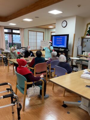 〇×クイズでは、「どうかな~?」と真剣に考えながら、答えを決めておられ、答えが発表されると「そうなんやね、分からんかったわ」、「当たったわ!!」との声が聞かれ、クリスマスについての知識を深めていました。