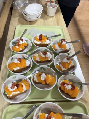 おやつ時にはスポンジケーキに生クリームやみかん、いちごジャム等をトッピングしたクリスマスケーキを召し上がりました。