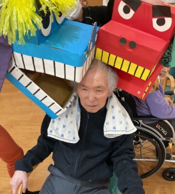 職員が段ボールで作った獅子頭を被り、皆様が今年も健康で沢山の福が来ますよう