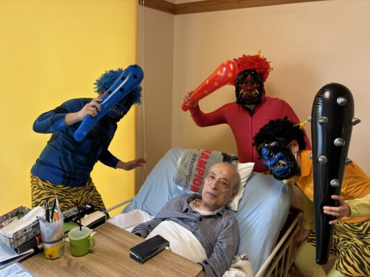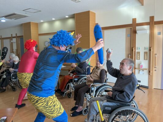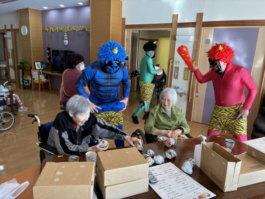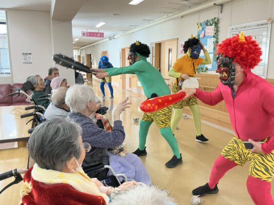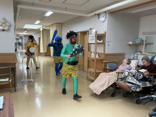 節分にちなみ、4体のカラフル鬼が現れ施設内を回りました。