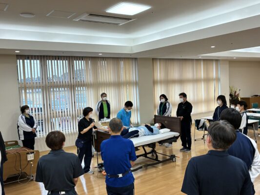 令和7年度の下期全体研修会では、各委員会から褥瘡や排泄ケア、見守りカメラを使用したリスクの回避など、報告と実技を交えた研修を行い、職員のスキルアップと情報の共有を図りました。
